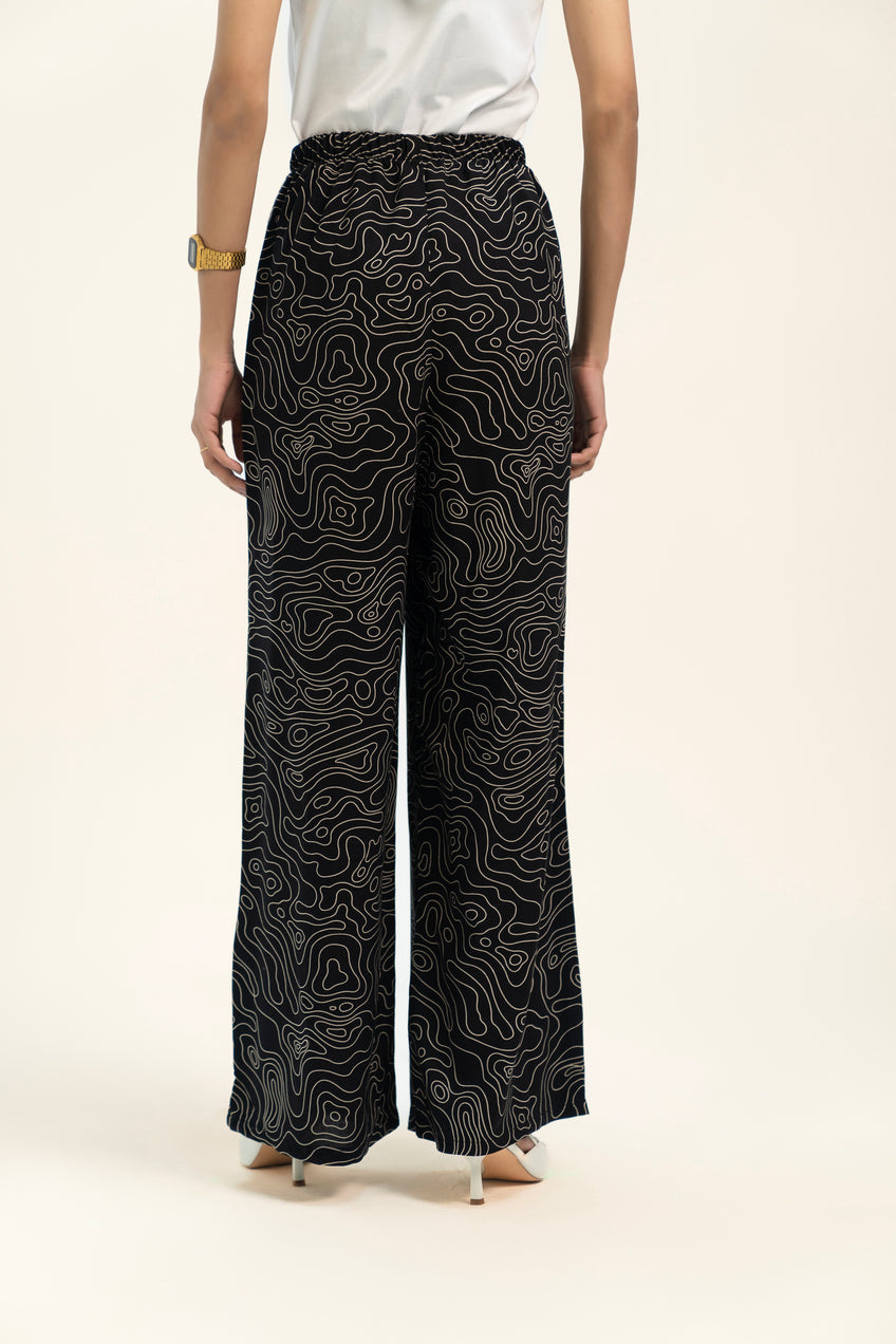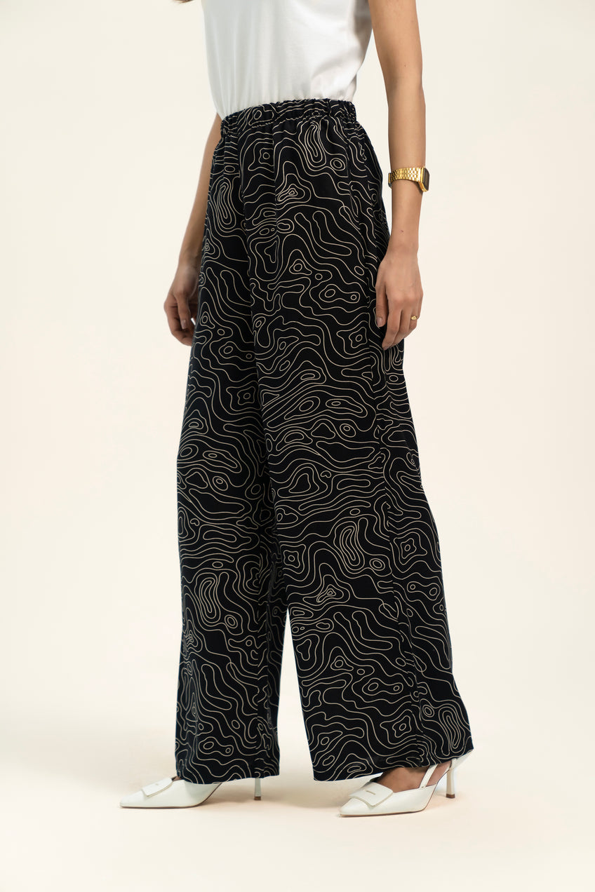 A chic addition to any collection, these black high-waisted trousers with a contemporary geometric print. While the elasticated waist guarantees a comfortable fit, the wide leg and high rise design create a pleasing appearance. Ideal for anyone who appreciates fashion.