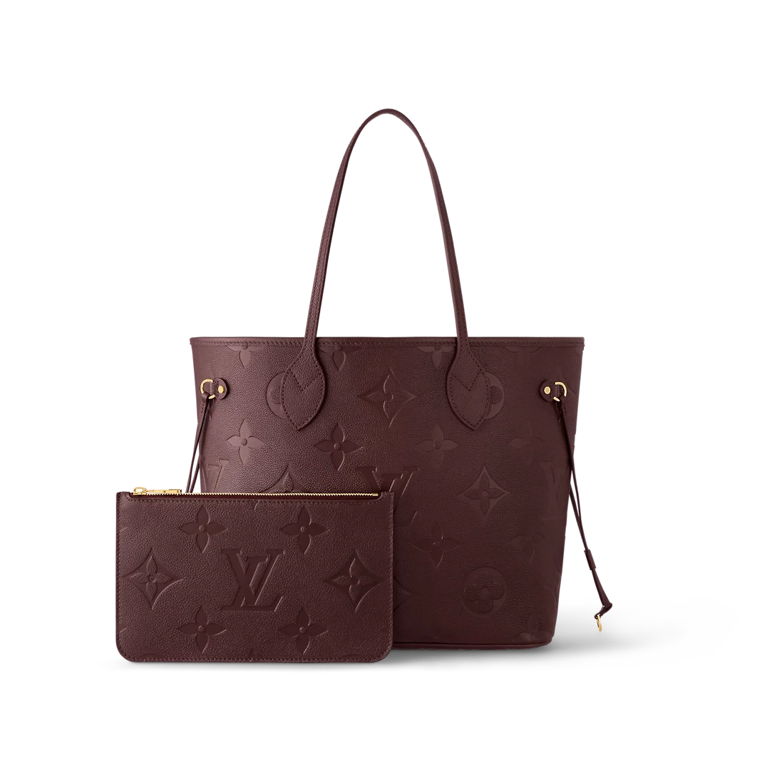 The Neverfull tote bag is made out of grained Monogram Empreinte cowhide and is finished with a removable pouch internal which is attached to the bag with a cord of leather. The bag is voluminous and with side lacings which can be cinched in to have a sleek look or left open to appear more casual. It is worked out with the Giant Monogram pattern.