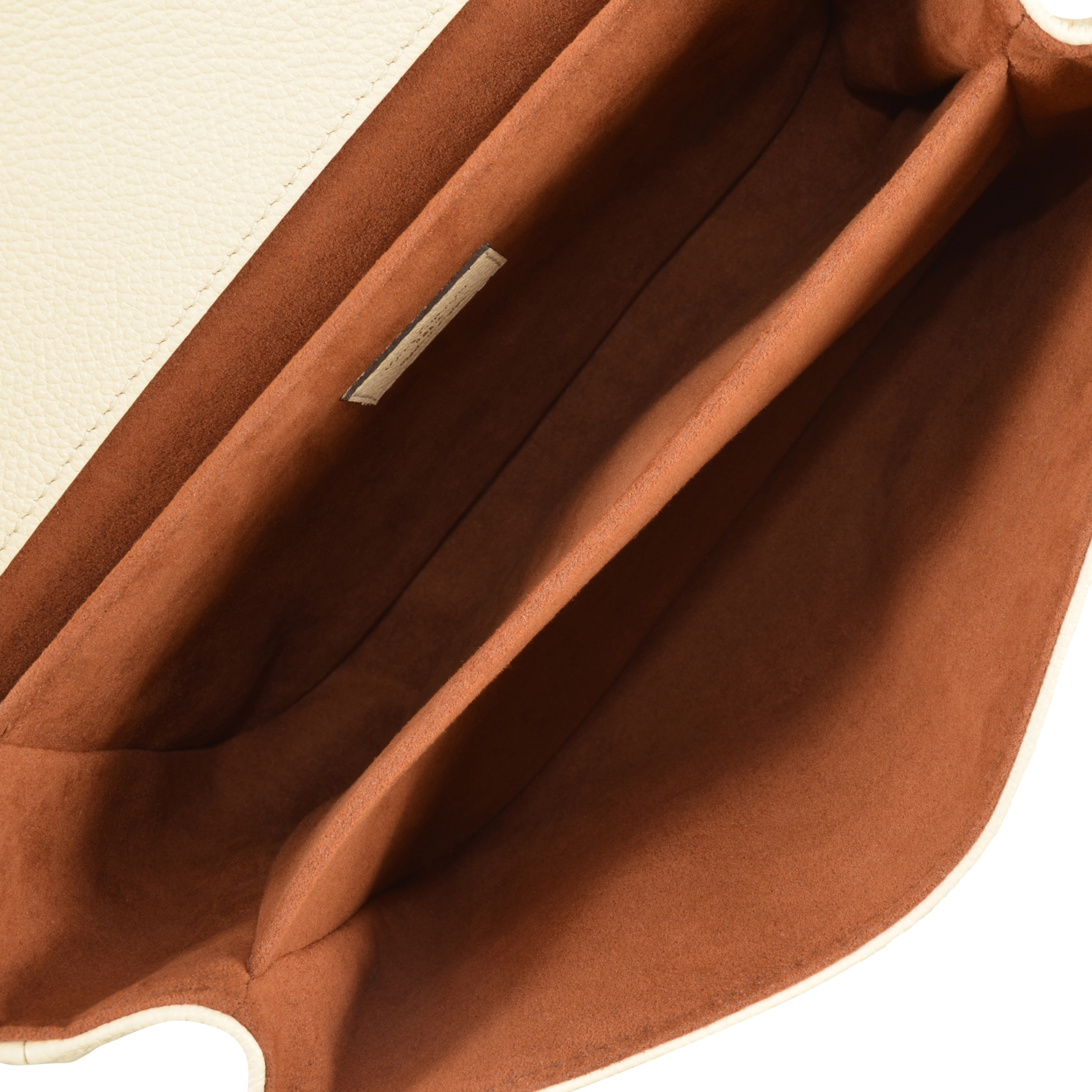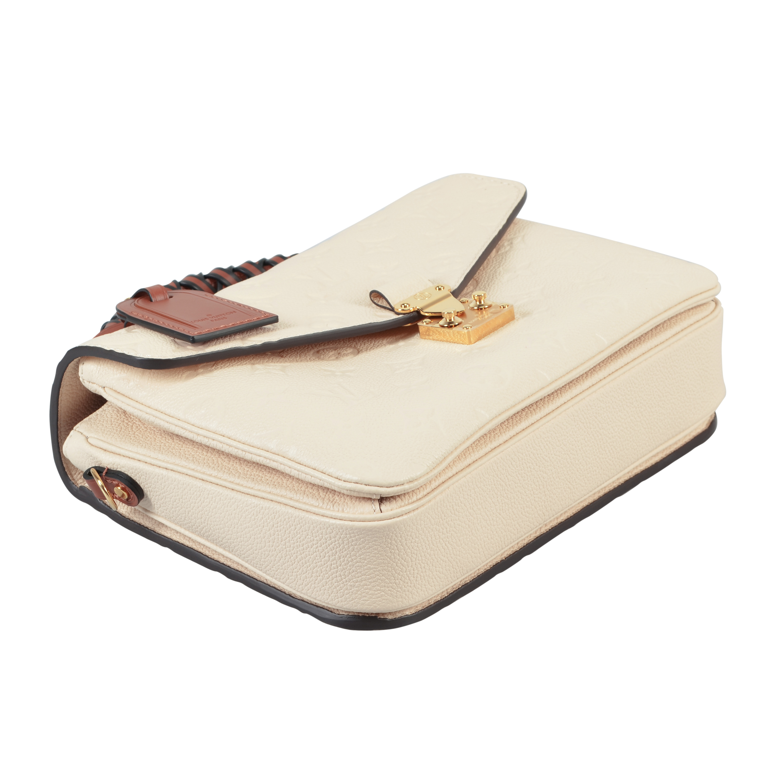 The original Louis Vuitton Pochette Métis Monogram Empreinte handbag makes the hearts of many women beat faster. This model impresses with its hand-braided and hand-painted leather handle, which gives the Métis a luxurious feel. Crafted from cowhide leather with an embossed Louis Vuitton Monogram, it features an angular silhouette and gold-tone hardware accents. A name tag and a detachable shoulder strap made of caramel-colored leather skillfully emphasize the delicate crème-beige of this handbag.
